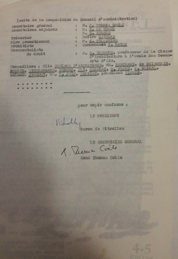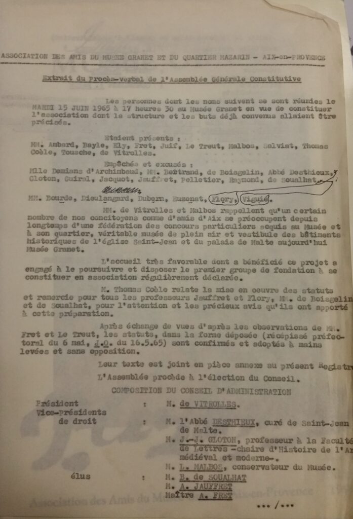 Juin 1965 voit la création de l‘association des Amis du Musée Granet et du Quartier Mazarin sous la présidence de Monsieur de Vitrolles et des vice-présidents de droit : Messieurs l’abbé Desthieux, J.J Gloton et L. Malbos