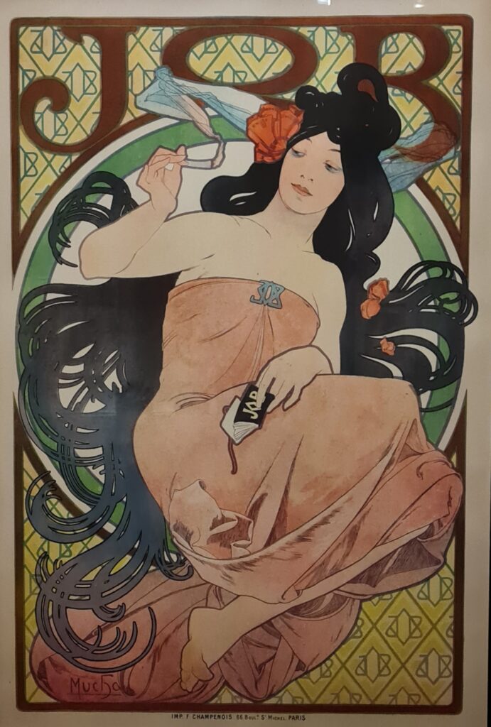 .À droite : ALPHONSE MUCHA ( 1860- 1839 ) Affiche pour le papier à cigarettes JOB – 1898 – Lithographie en couleurs — Photo Aamg