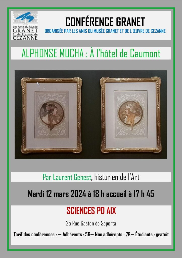 Laurent Genest vous fera découvrir l’étendue de l’œuvre d’Aphonse Mucha que l’hôtel de Caumont retrace à travers 120 œuvres. «À côté des œuvres les plus appréciées de l’époque révélant Mucha en tant que plus grand représentant de l’Art nouveau (comme les célèbres affiches publicitaires dont celles réalisées pour Sarah Bernhardt ainsi que les fameux panneaux décoratifs), vous pourrez admirer les peintures de l’artiste, rarement montrées, à travers une lecture symboliste et allégorique. L’exposition révèle également son travail méconnu de la photographie, à la fois dans son studio du Paris fin-de-siècle mais aussi à travers les photographies documentaires et de mises en scène qu’il a produites dans le cadre de ses recherches pour sa série de peintures monumentales à la gloire de l’histoire de son peuple L’Épopée slave.» ( Communication de l’hôtel de Caumont)