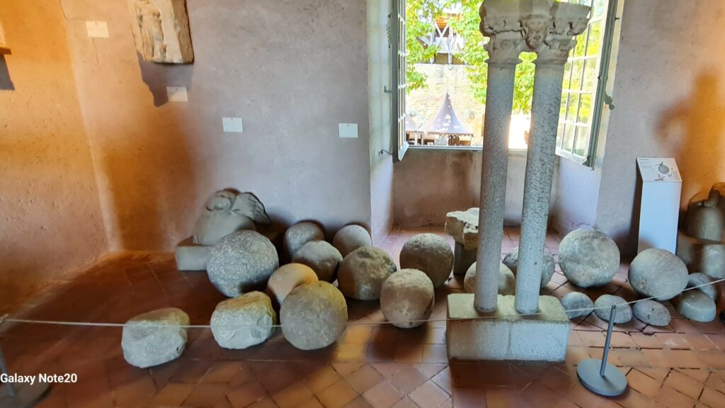 CITÉ MÉDIÉVALE — LES BOULETS — En pierre de 50 à 100 kg, avec les trébuchets, engins de tirs redoutables, les boulets peuvent atteindre jusqu’à 200m – Photo Aamg