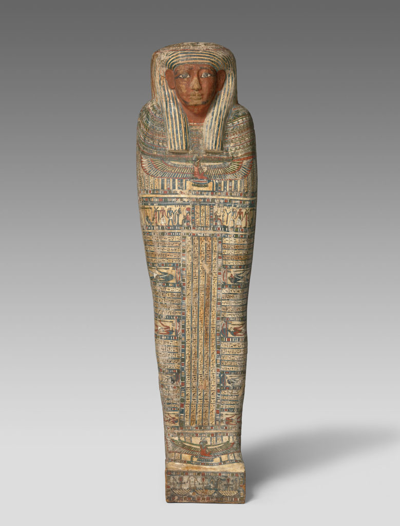 Cercueil de Ptahirdis et momie — Cercueil en bois entoilé , stuqué et peint — 185x50x42cm — Collection du musée Granet — Donation Bourguignon de Frabregoules