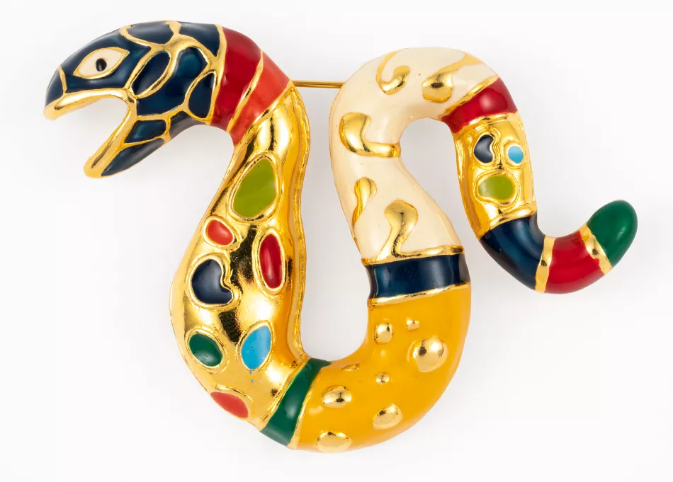 Niki de Saint Phalle, Serpent tête bleue, 1998. Broche en métal doré et émaillé, 7,5 × 6 cm, Niki Charitable Art Foundation,© 2025 Niki Charitable Art Foundation / Adagp, Paris; Photo: © 2025 NIKI CHARITABLE ART FOUNDATION, All rights reserved