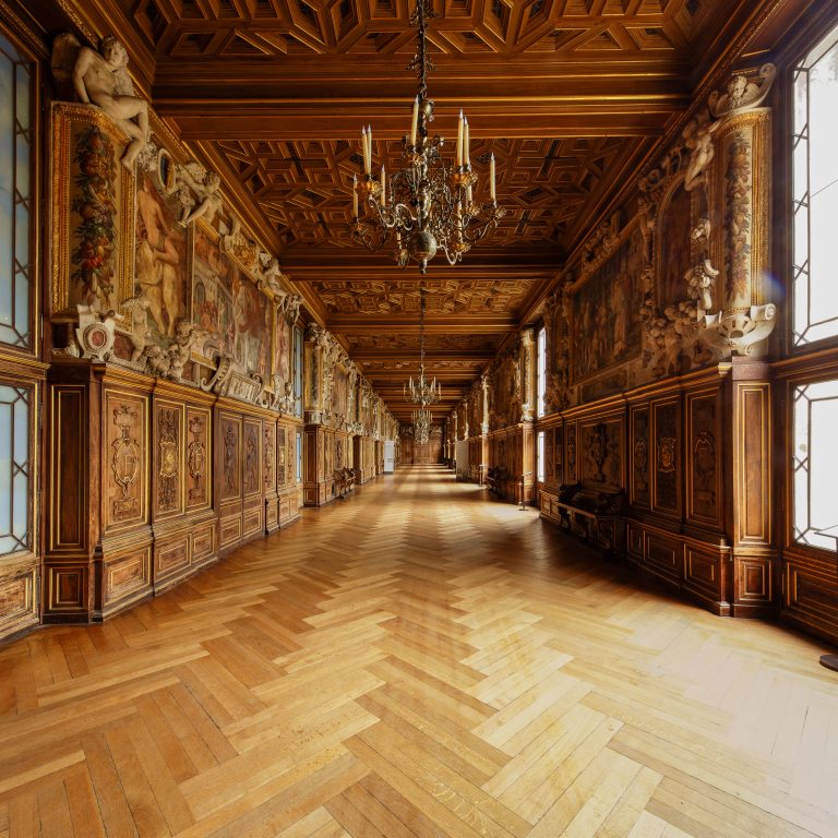 «Pour relier la chapelle à ses appartements, François Ier fit construire une spectaculaire galerie où les lambris, les stucs et les fresques des Italiens Rosso et Primatice forment un décor qui marqua durablement la création artistique européenne sous le nom d’« École de Fontainebleau ».(communication du château)»