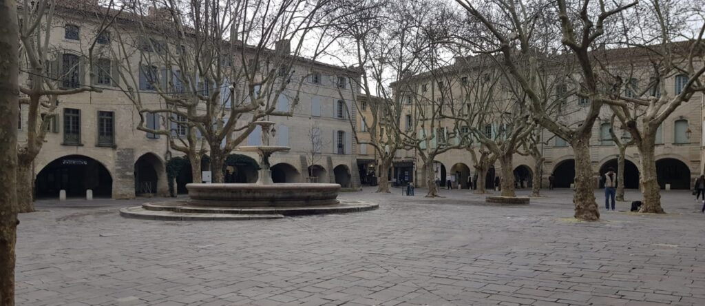UZÈS — La place emblématique d’Uzès — la Place aux Herbes — est un carré ombragé de platanes, entouré d’arcades de pierre blonde. Elle offre une atmosphère à la fois médiévale et méridionale. Ses proportions harmonieuses, ses façades sobres et la présence de la fontaine centrale en font le cœur convivial de la ville. Photo Aamg CD