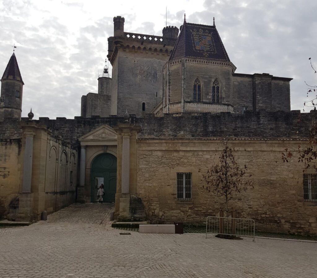 À gauche UZÉS — Palais ducal et blason de la maison de Crussol d’Uzès visible sur le toit du château. Photo Aamg HR
